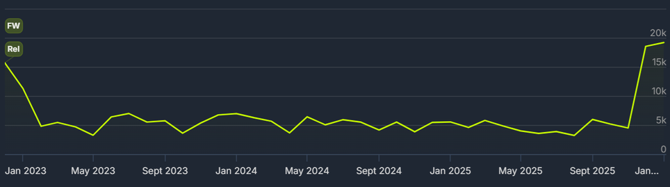 El pico anterior de casi 16 mil jugadores se registró en el lanzamiento en Steam en 2022. Desde entonces, el número de jugadores en línea se mantuvo dentro de 5-7 mil.