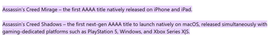Recientemente, una publicación en el perfil del productor de Ubisoft, Krasimira Yakovlieva, atrajo la atención de la comunidad. Indicó Assassin's Creed Mirage como el «primer juego AAAA lanzado de forma nativa en iPhone y iPad»:
