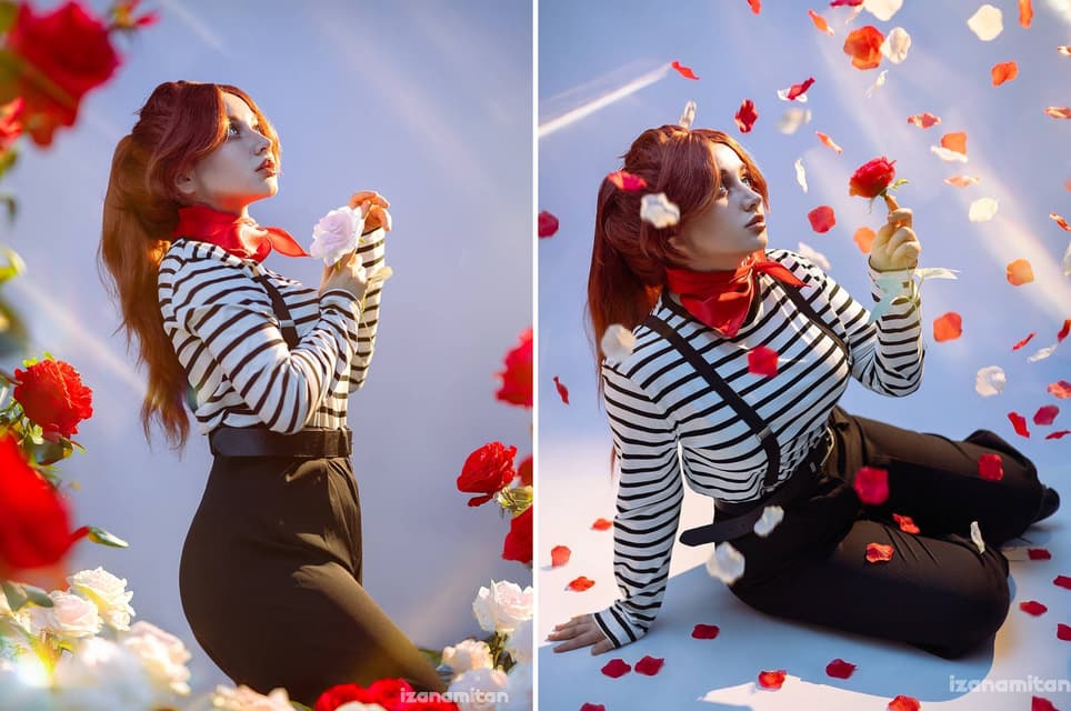 La modelo Olga «Izanamitan» Krupskaya, sin la ayuda de fotógrafos profesionales ni los servicios de estudios especializados, realizó sola una pequeña sesión de fotos en su casa, utilizando un trípode. Se transformó en Mael, una de las heroínas jugables de Clair Obscur: Expedition 33.