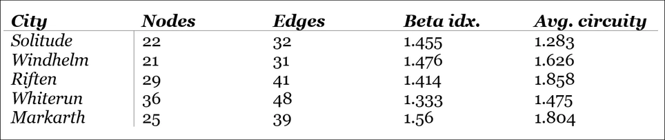 En la tabla se muestran los datos (Nodos / Aristas del grafo, índice Beta y valores medios del coeficiente de rodeo de caminos) para las ciudades de: Soledad, Ventalia, Riften, Carrera Blanca, Markarth.