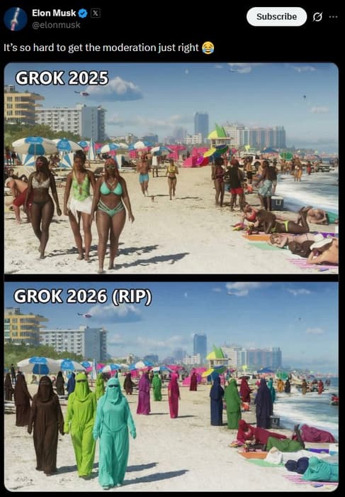 En el contexto de la investigación, el empresario Elon Musk, propietario de la red social X, bromeó en su red social diciendo que configurar la moderación a menudo es muy difícil. Respaldó su comentario con una imagen editada de Grand Theft Auto VI.