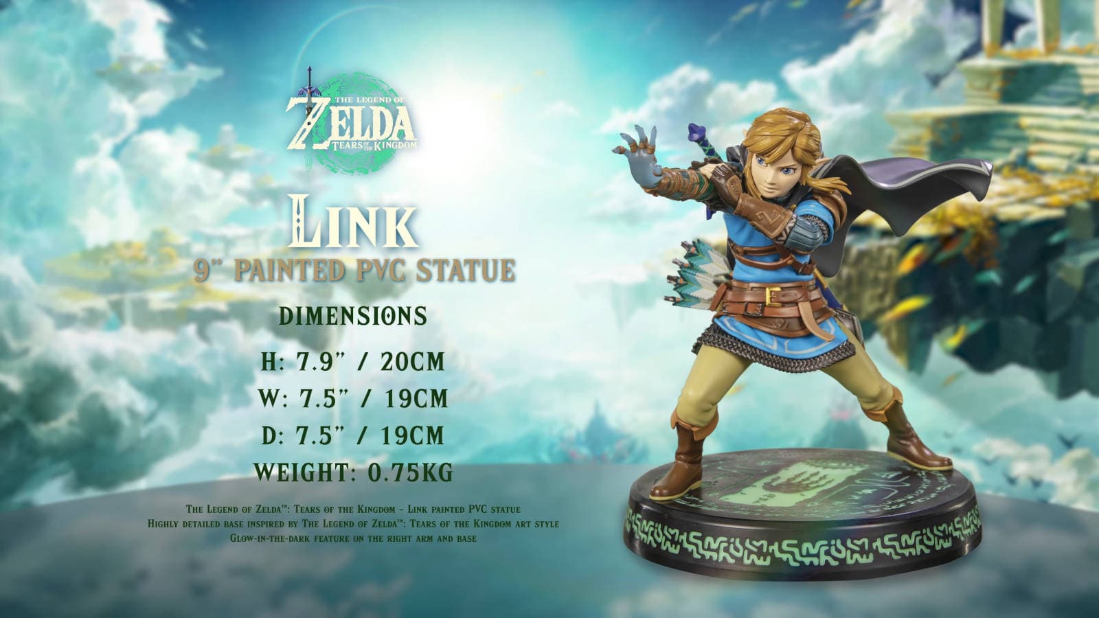La altura del héroe de Hyrule, fabricado en cloruro de polivinilo, es de 20 cm, la anchura de 19 cm, la profundidad de 19 cm y el peso de 0,75 kg. Dado que se trata de un trabajo de First 4 Figures, lo más probable es que haya versiones estándar, exclusiva y definitiva de la estatua.