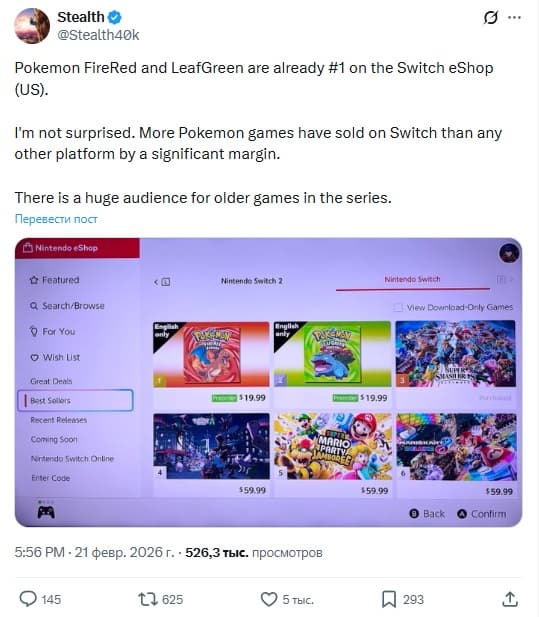 Sin embargo, según el informante Stealth40k en la red X, ambos juegos ya se han convertido en superventas en Nintendo Switch eShop. Pokémon FireRed ocupa el primer lugar, Pokémon LeafGreen el segundo, superando a éxitos como Super Smash Bros. Ultimate. En las listas también se encuentran Pokémon Legends: Z-A, Mario Party! Jamboree y Mario Kart 8 Deluxe.