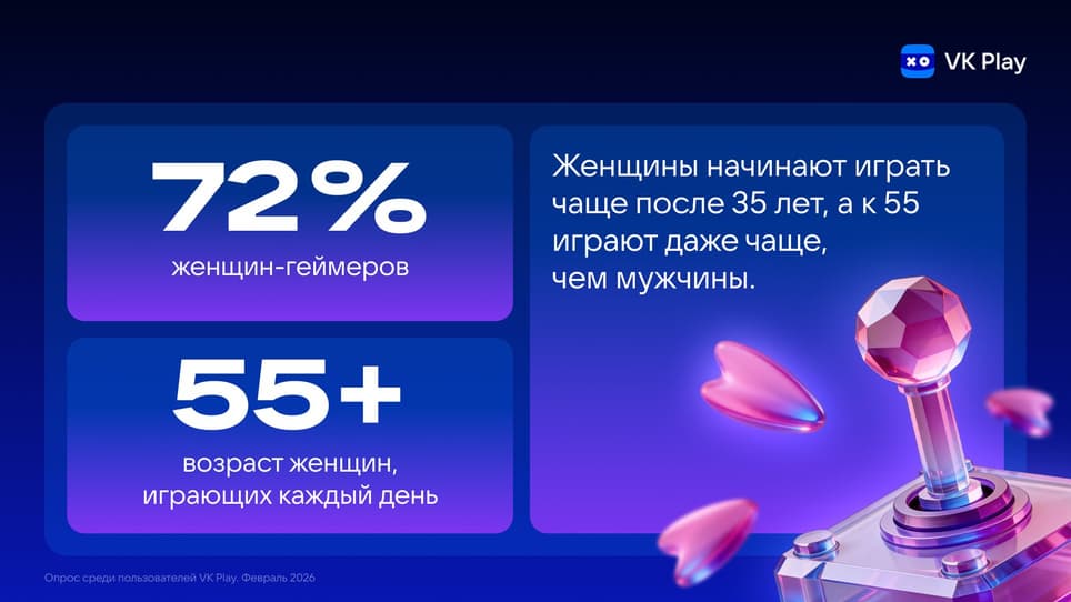 El análisis de la plataforma VK Play muestra que la audiencia femenina de juegos se intensifica con la edad, especialmente después de los 35 años. Seis de cada diez jugadoras utilizan los juegos para encontrar pareja romántica, un tercio de ellas ve en el juego cooperativo el formato ideal para una cita, y entre las mayores de 55 años, el 72% se sumerge diariamente en mundos virtuales.
