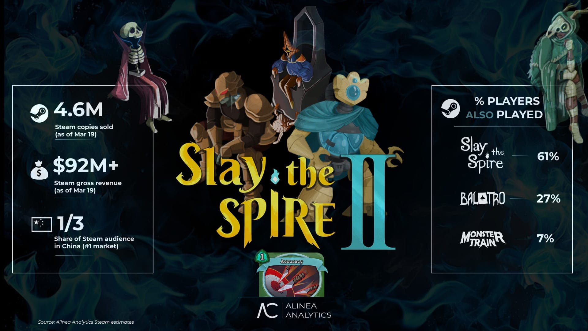 Slay the Spire 2 mostró uno de los comienzos más fuertes entre los juegos indie en la historia de Steam. Según estimaciones de la compañía analítica Alinea Analytics, en las primeras dos semanas después del lanzamiento en acceso anticipado, el proyecto vendió alrededor de 4,6 millones de copias y generó más de $92 millones en ingresos.
