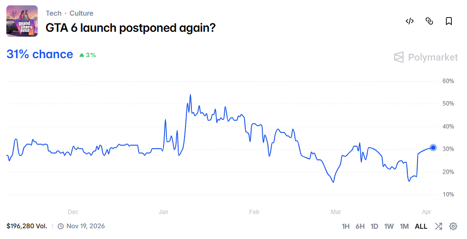 Aunque el jefe de Take-Two, Strauss Zelnick, ha asegurado constantemente que se cumplirá el plazo del 19 de noviembre de 2026, la falta de material nuevo hace que los jugadores miren el calendario con ansiedad, temiendo un cambio a 2027. Los ánimos se reflejan en los mercados de predicciones: en la plataforma Polymarket, el 31% de los participantes cree en un tercer retraso. Los usuarios incluso discuten qué sucederá primero: el lanzamiento del juego, el lanzamiento del nuevo álbum de Rihanna, el bitcoin a un millón de dólares o la "segunda venida de Cristo".