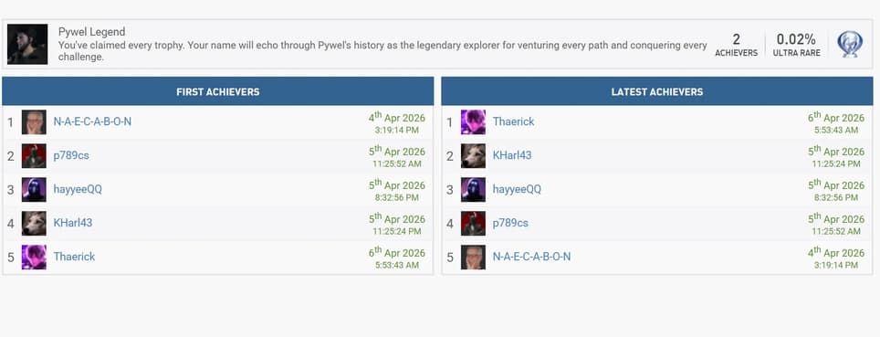 El usuario con el nick N-A-E-C-A-B-O-N gastó exactamente 15 días para "cerrar" el juego de Pearl Abyss. Con un tiempo total de 285 horas, esto da casi irreales 19 horas de juego al día. Esto demuestra que el mundo de Pywell no solo es hermoso, sino también enorme, desafiando incluso a los más persistentes cazadores de logros.