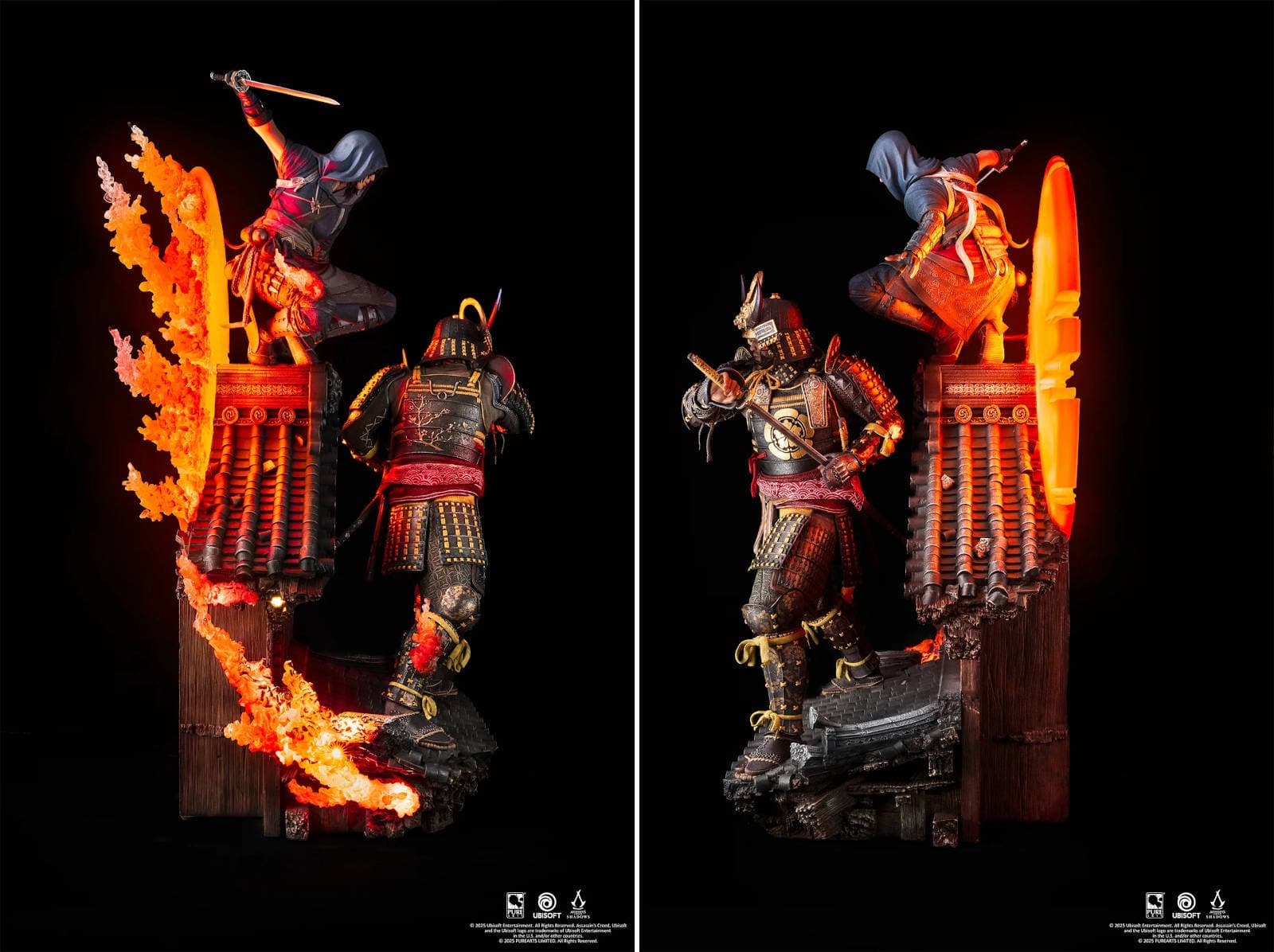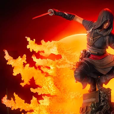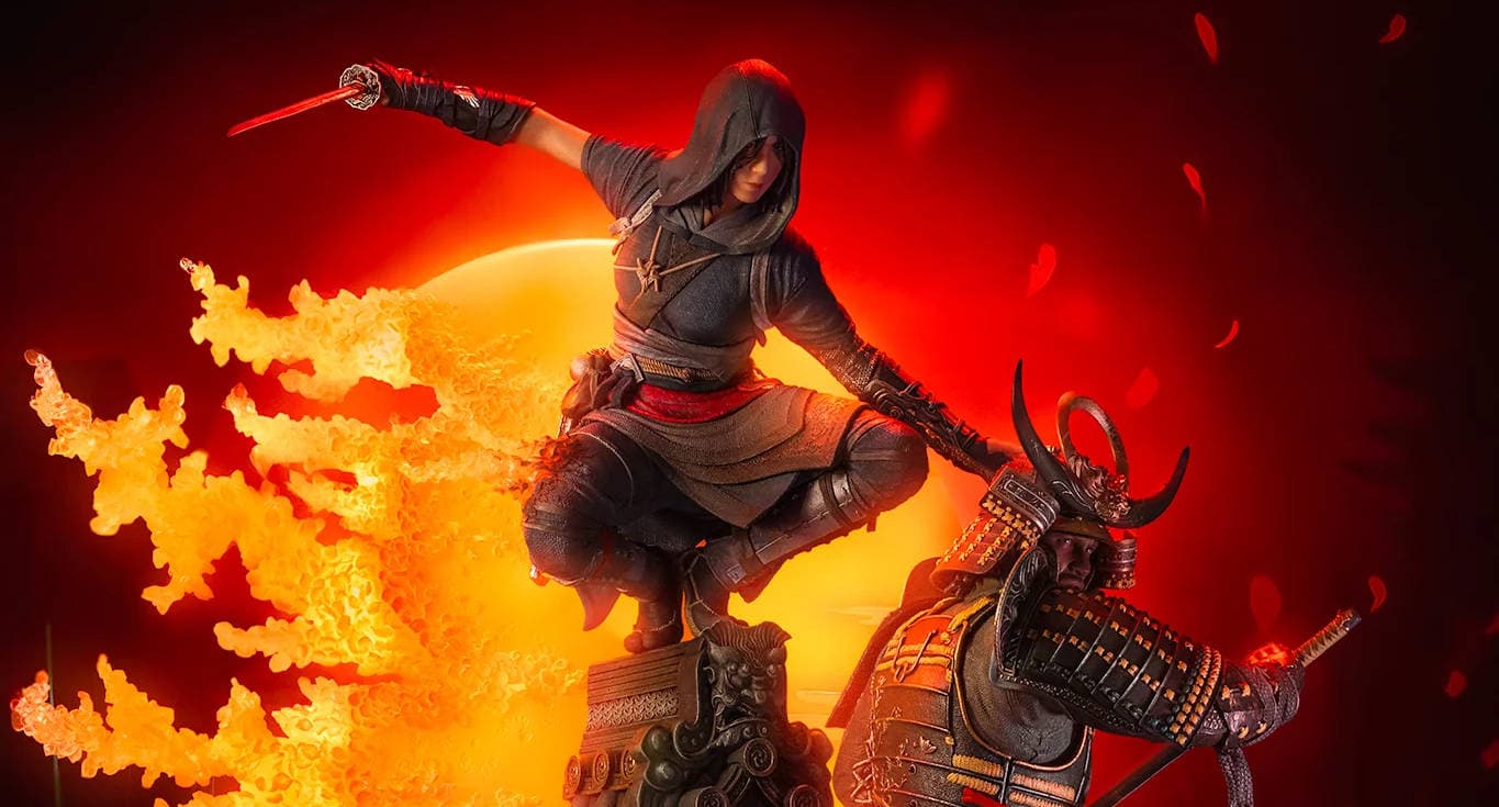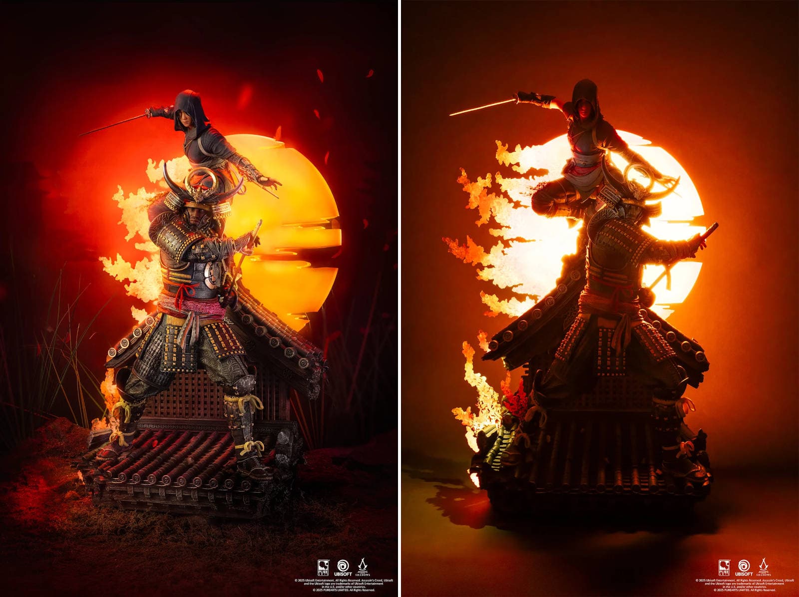 Naoe, con su hoja oculta, permanece agazapada discretamente en la cornisa del intrincado techo del tenshu, lista para proteger su legado, mientras Yasuke irradia poder y fuerza. Juntos, están preparados para abrir una nueva era para Japón. El característico efecto Animus de PureArts con iluminación LED ilumina la estatua sobre el fondo de un sol deconstruido.