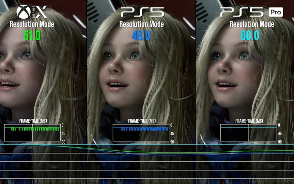 La que mejor se desempeñó fue PS5 Pro. Gracias a la tecnología PSSR, la imagen se ve considerablemente mejor, a pesar de una resolución base más baja de 864p. La consola admite todos los efectos gráficos y mantiene un rendimiento más estable. También hay un modo de 120 Hz con una tasa de entre 60 y 100 FPS y compatibilidad con VRR.