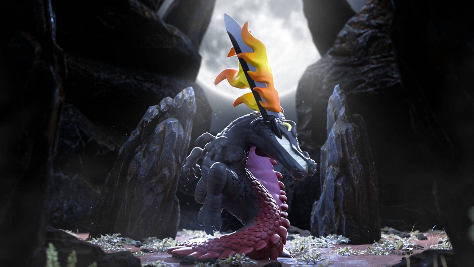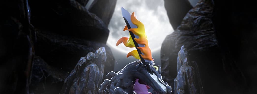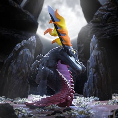 Al despegar del suelo por la fuerza de un furioso balanceo, sus oscuras extremidades se curvan hacia delante sobre el torso dentado, mientras por la espalda y la gruesa cola se extienden espinas de color rojo oscuro.