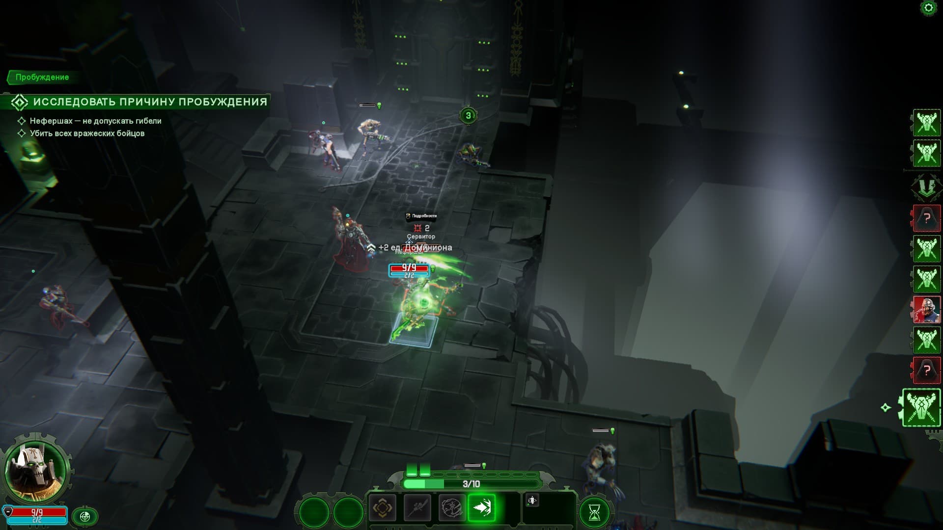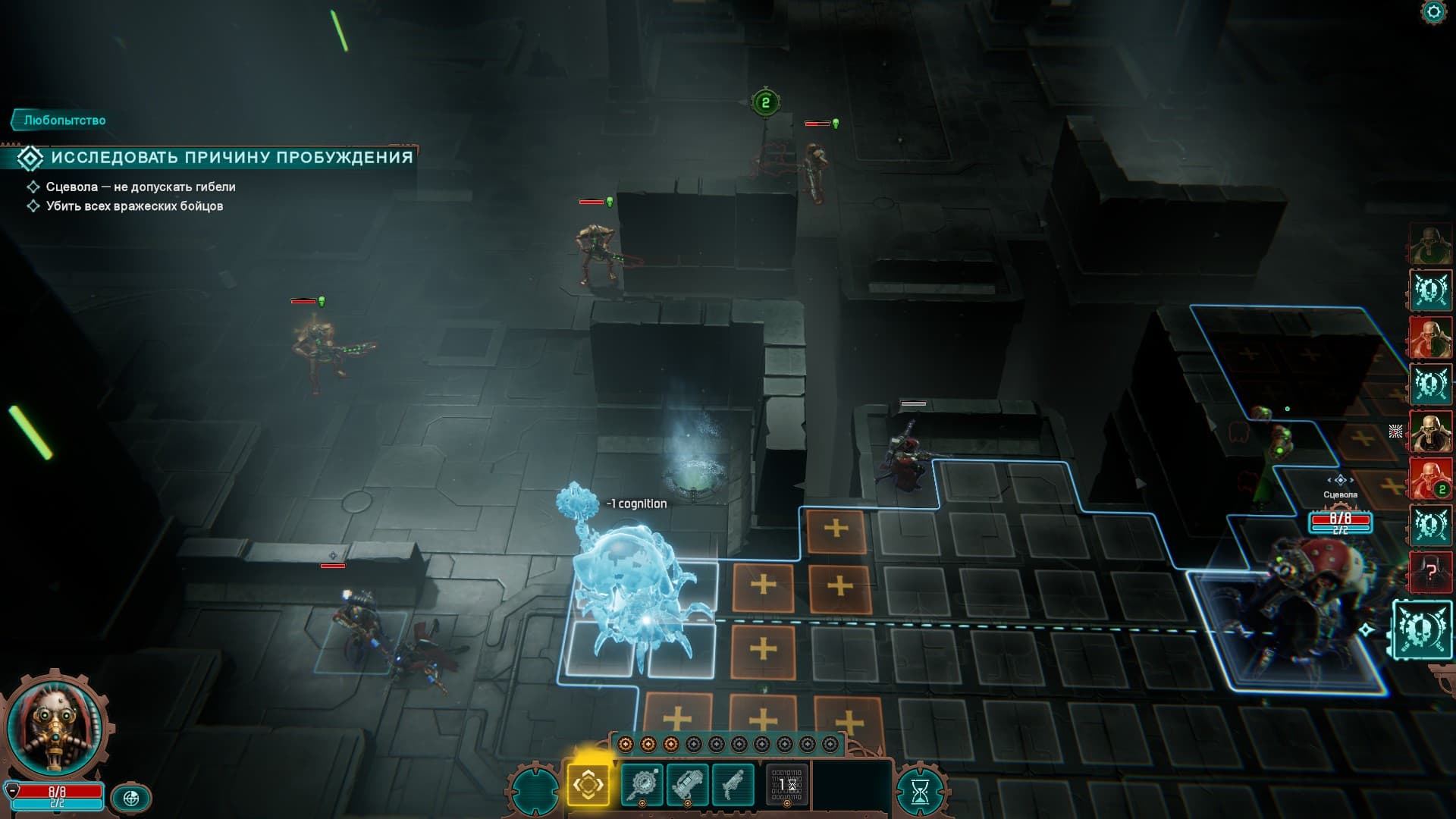 En la batalla, los mechanicus no han sufrido cambios significativos. Al principio, debes desplegar tu cohorte para destruir a los enemigos. Los mechanicus pueden usar puntos de conocimiento, que les permiten activar poderosas habilidades y aumentar la cantidad de puntos de movimiento. La principal innovación fue la propia Scevola, que de consejera se convirtió en una luchadora completa: ¡sus habilidades de combate son dignas de respeto!