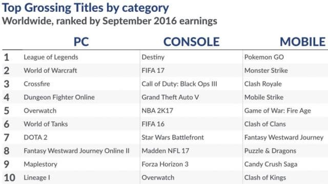 На РС лидирует League of Legends, опережая World of Warcraft, Crossfire, Dungeon Fighter Online и Overwatch. В мобильном сегменте, ожидаемо, всех обскакали покемоны.