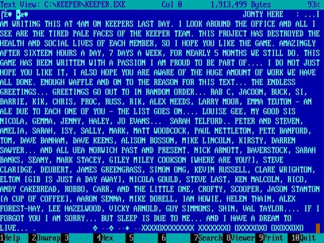 Программист Кристер Кайлита (Christer Kaitila) обнаружил в .exe-файле игры Dungeon Keeper 1997 года выпуска для MS-DOS сообщение от одного из авторов проекта о систематических переработках.