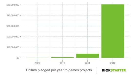 Бурный рост начался с инициативы Тима Шафера (Tim Schafer) с Double Fine Adventure, именно этот коллектив привлек внимание 87 тыс. заинтересованных поклонников, которые суммарно проспонсировали проект суммой почти в 3,5 млн. долларов. С того момент представители игровой индустрии по-новому взглянули на Kickstarter.