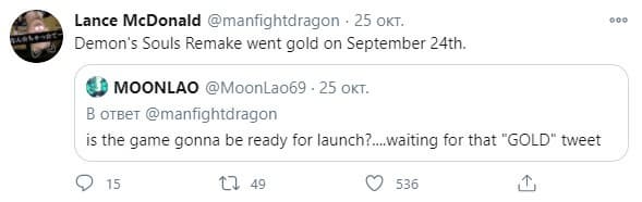 Bluepoint Games не объявляла о завершении работы над Demon's Souls для PS5, поэтому некоторые геймеры были обеспокоены тем, что запуск под угрозой. Ситуацию прояснил видеоблогер Лэнс Макдональд, который назвал точную дату, когда игра ушла на золото.