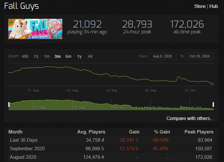 Падение в топе началось еще с конца августа, а в сентябре только усилилось. Разработчикам удалось привлечь игроков только стартом нового сезона. Это лишь немного улучшило положение и подняло онлайн с 40 до 80 тысяч игроков. Тем не менее, вернулись игроки не надолго и на текущий день в Fall Guys играет менее 29 тысяч пользователей.