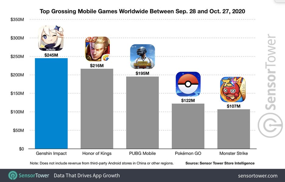 Китайская компания miHoYo выпустила Genshin Impact 28 сентября и всего за месяц успела стать одной из самых прибыльных игр за всю историю мобильной индустрии. Бюджет проекта разработчики смогли окупить всего за первые две недели, а на сегодняшний день Genshin Impact заработала 245 миллионов долларов.