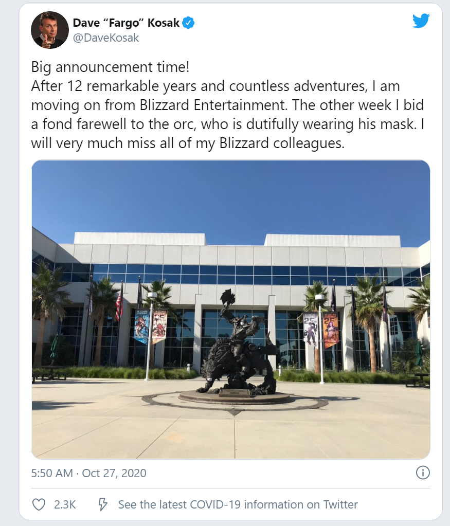 В своем Twitter Дейв Косак, ранее занимавший должность дизайнера квестов и ведущего дизайнера сюжета World of Warcraft, затем трудившийся в команде Hearthstone на должности ведущего дизайнера миссий, сообщил о том, что покидает ставшей родной за столько лет компанию и переходит в Deviation Games.