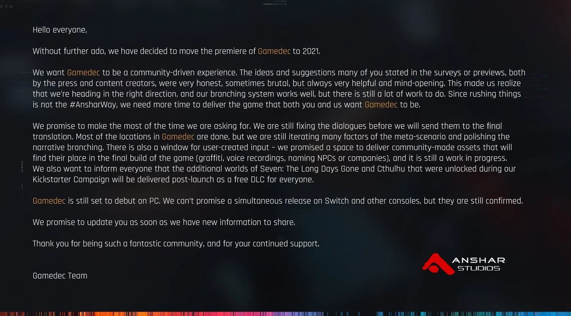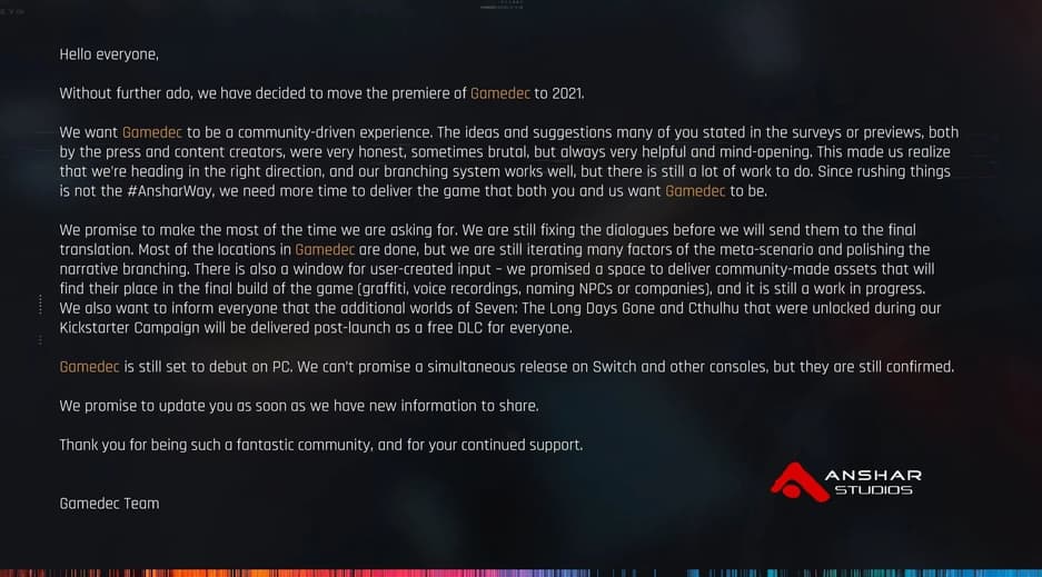 Разработчики Anshar Studios хотят удостовериться, что Gamedec выйдет в наилучшем виде, и не намерены спешить и перерабатывать. Изначально игра выйдет на PC, а позже попадёт на консоли. Конкретная дата выхода пока не называется.