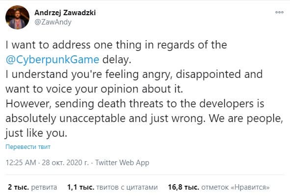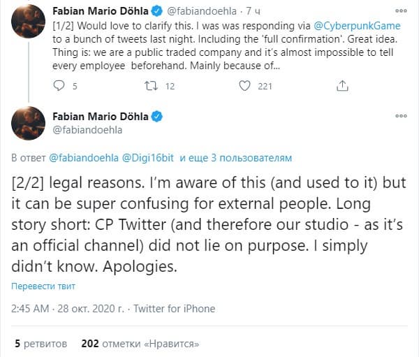 Фабиан Марио Дохла, который ответственен за твиттер Cyberpunk 2077, сослался на напряженную ситуацию: не все сотрудники CD Projekt RED знали о принятии такого важного решения. Никто из представителей студии не лгал специально.