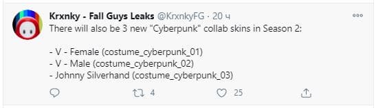 Пользователь Twitter KrxnkyFG сообщает, что несколько файлов в игре указывают на коллаборацию с Cyberpunk 2077 в виде трех костюмов: мужчина Ви, женщина Ви и фронтмен группы Samurai Джонни Сильверхенд, роль которого исполняет Киану Ривз.