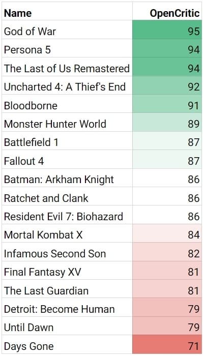 На вторую также стоит обратить внимание, так как на ней показан рейтинги каждой игры на OpenCritic. Владельцы PlayStation 5 смогут приобщиться к пятёрке игр с оценкой 90+ %. У некоторых проектов она намного меньше, к примеру, Days Gone, но проект явно заслуживает более высокого балла, так как давно избавлен от «детских болячек».