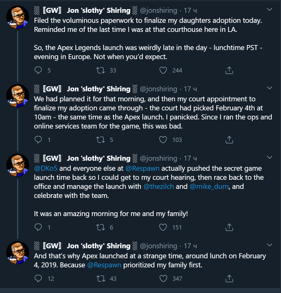 Я запаниковал. Так как я руководил командой по онлайн-сервисам игры, это было очень плохо. Но Respawn фактически отодвинула время релиза нашей секретной на тот момент игры, чтобы я мог попасть на судебное слушание, а затем вернуться в офис и управлять запуском со своей командой. Это было чудесное утро для меня и моей семьи! Вот почему Apex Legends была запущена в такое необычное время — ближе к обеду 4 февраля 2019 года. Для Respawn приоритетом стала моя семья.