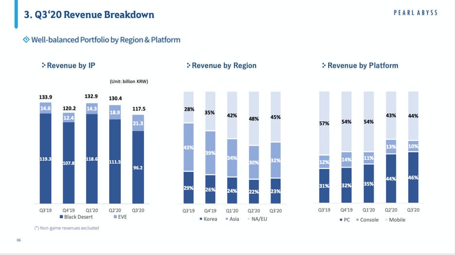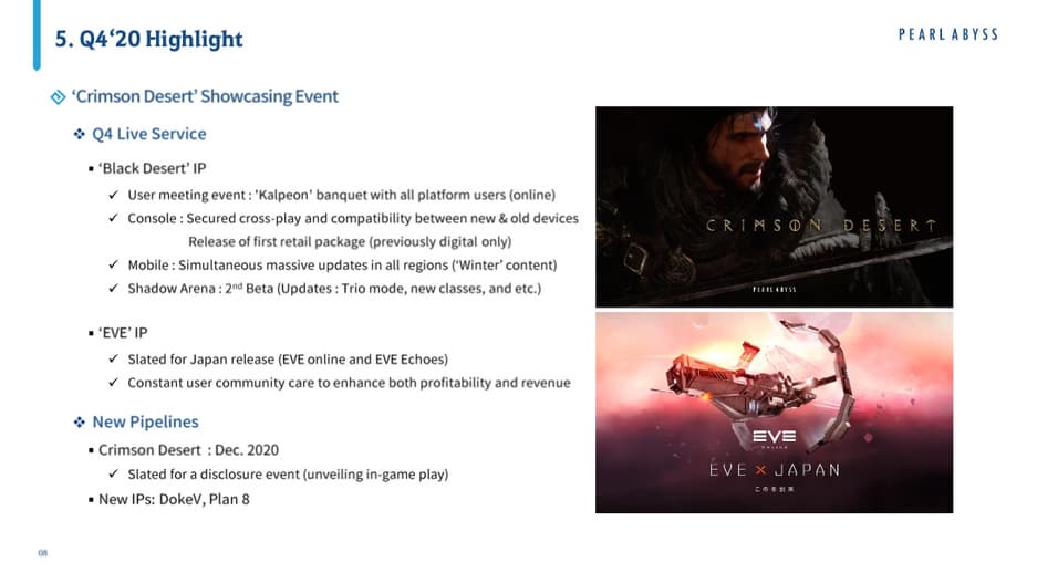 В финансовой отчете опубликованном Pearl Abyss за третий квартал 2020 главенствующую роль занимают две основные франшизы компании — Black Desert и EVE. Но также упоминания были удостоены новые проекты: DokeV, онлайн-шутер Plan 8 и ожидаемая многими сюжетно ориентированная MMORPG Crimson Desert.