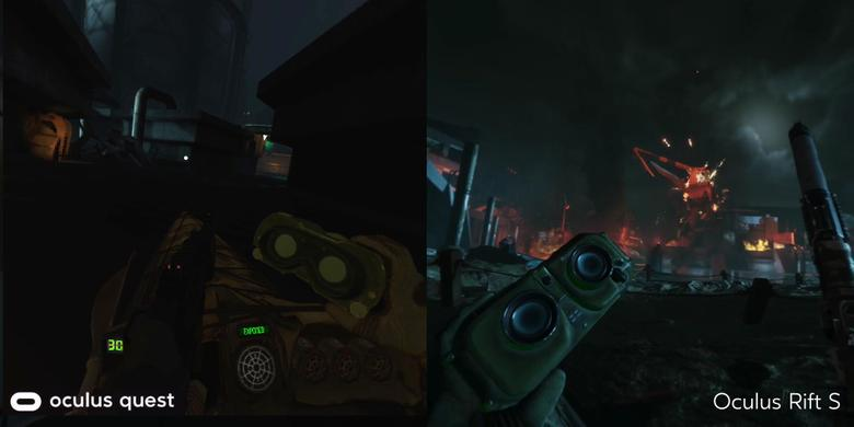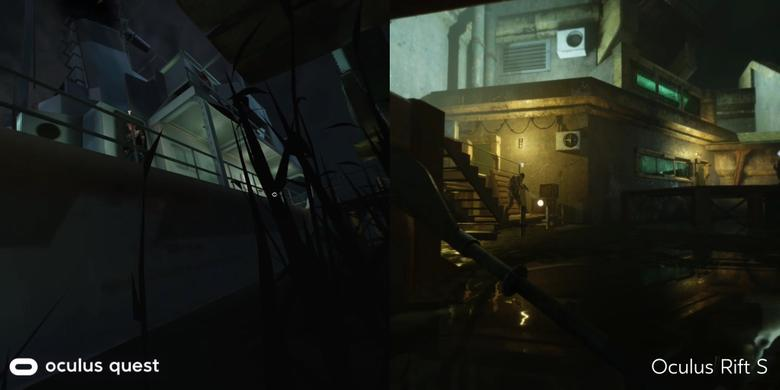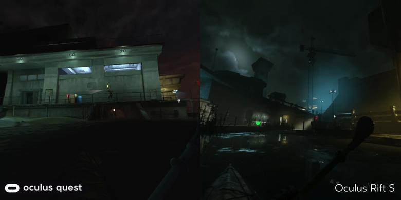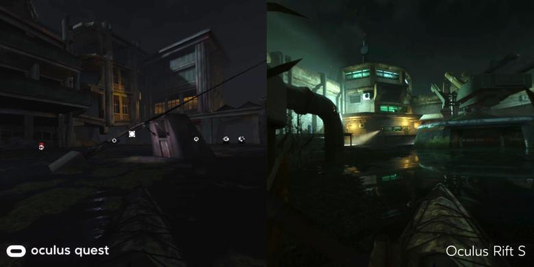Если в версии для Rift вы понимаете, почему вражеский солдат вас не видит, то в версии для Quest отсутствие теней создает вопрос. Как это так враг не видит игрока, когда тот идеально освещается? В остальном версии идентичны.