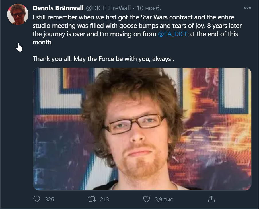 «Я до сих пор помню, когда мы впервые получили контракт по« Звездным войнам », и все работники в студии ощущали мурашки на коже и не скрывали слезы радости», - написал он в Twitter . «Восемь лет спустя путешествие закончилось, и я ухожу из DICE в конце этого месяца. Спасибо всем. Да пребудет с вами Сила всегда».