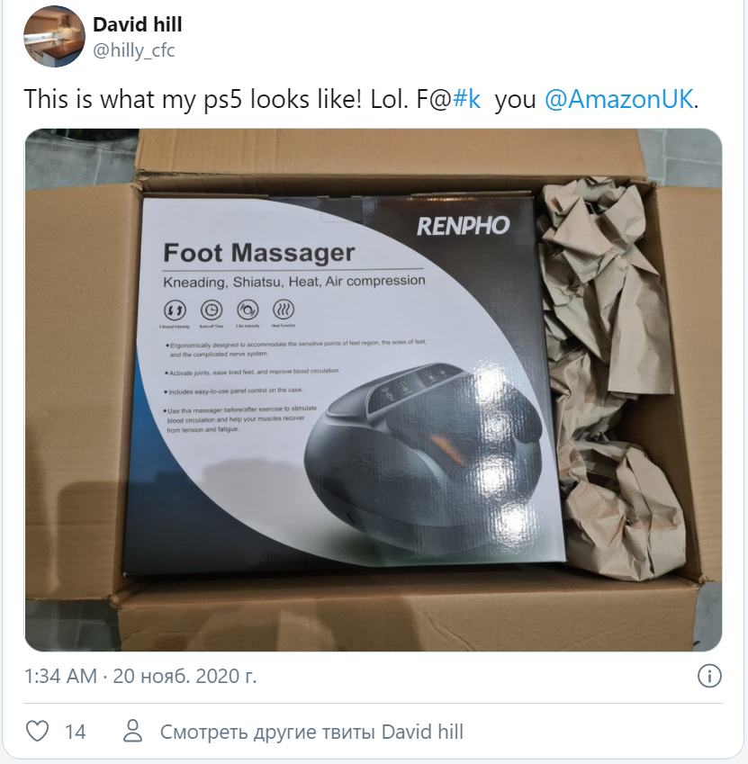 Пользователи принялись массово возмущаться и делиться своими грустными историями в Twitter. Так, вместо Playstation 5 жаждущим приобщиться к новому поколению были присланы массажеры для ног, кошачьи корма и иные слабо связанные с консолью предметы. Дошло до того, что стали совершаться нападения на грузовые фургоны, везущие консоли в магазины. Amazon UK творящееся безумие пока официально не прокомментировал.