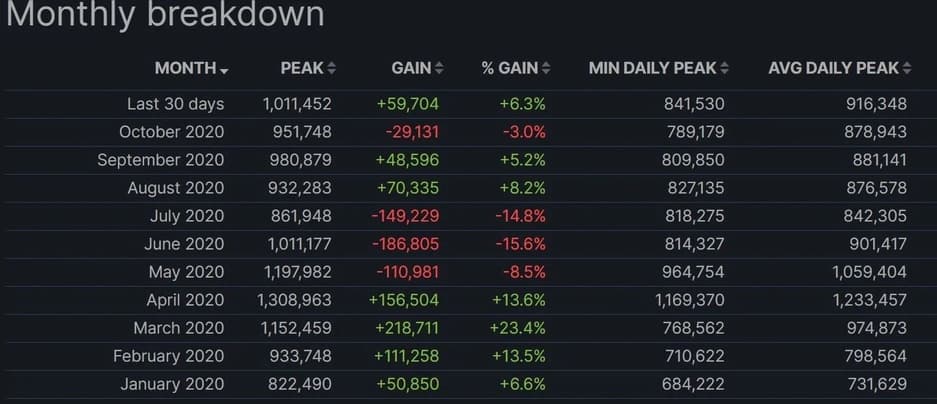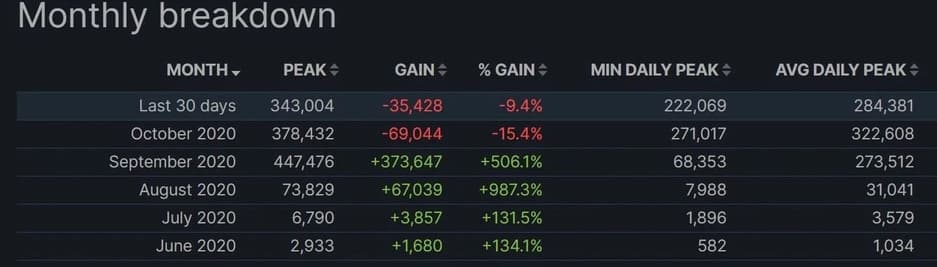 Among Us - один из самых больших сюрпризов текущего года, благодаря успеху у Twitch-стримеров. Лучшим периодом для игры студии InnerSloth стал рубеж сентября и октября – именно тогда в игре в Steam в среднем находилось более 250 тысяч игроков в день (на пике более 400 000). Хотя общее количество явно, намного выше из-за популярности проекта на мобильных устройствах. Но сейчас интерес к Among Us снижается.