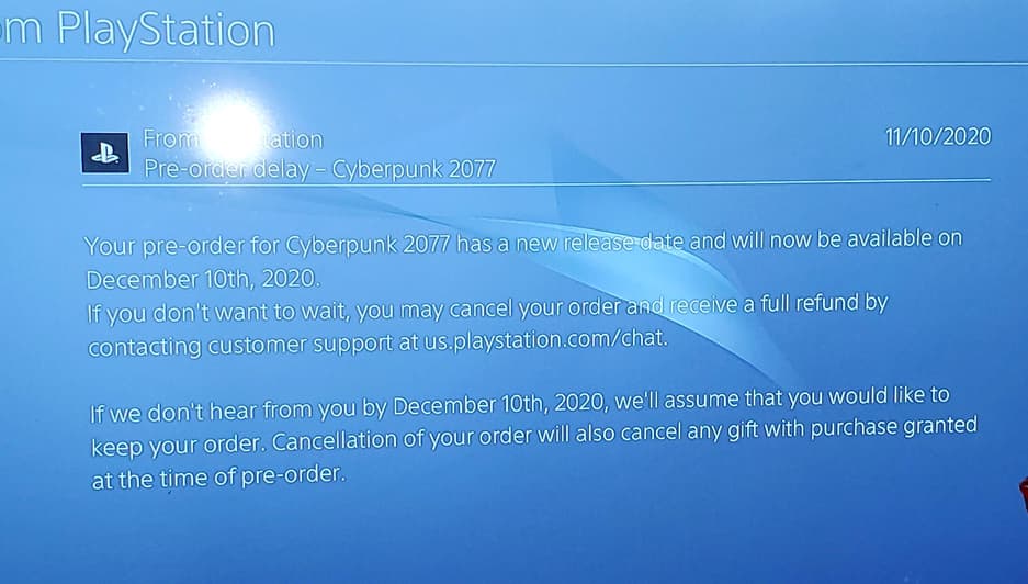 Компания Sony начала массовую рассылку электронных писем среди игроков предлагая возврат средств за предзаказ грядущего ролевого проекта от CD PROJEKT RED. Причина такого предложения со стороны компании перенос игры с 19 ноября на 10 декабря.