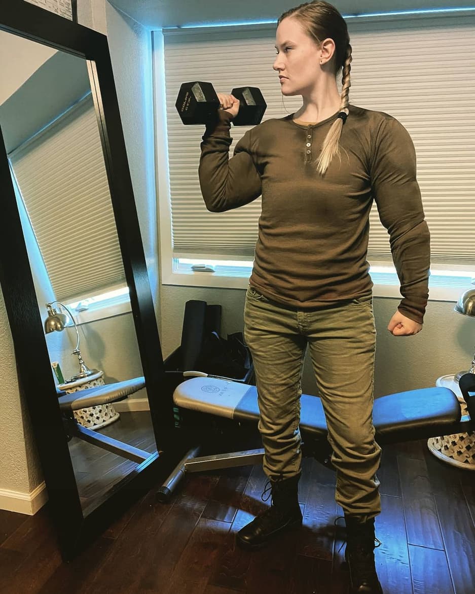 Стоит отметить, что Меттлер довольно убедительно передала образ Эбби, попозировав с гантелей, оружием и сделав вид, что трапезничает буррито.