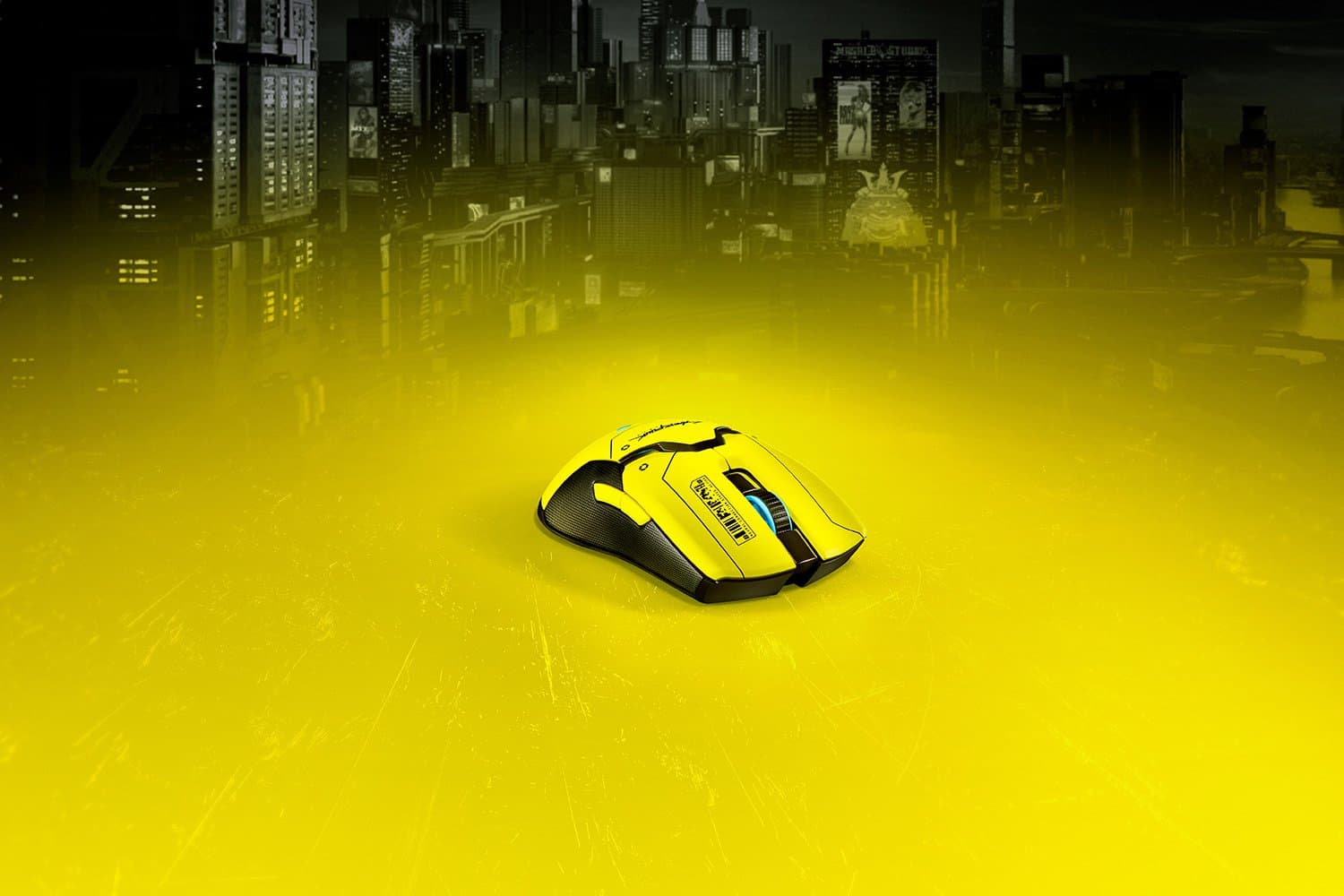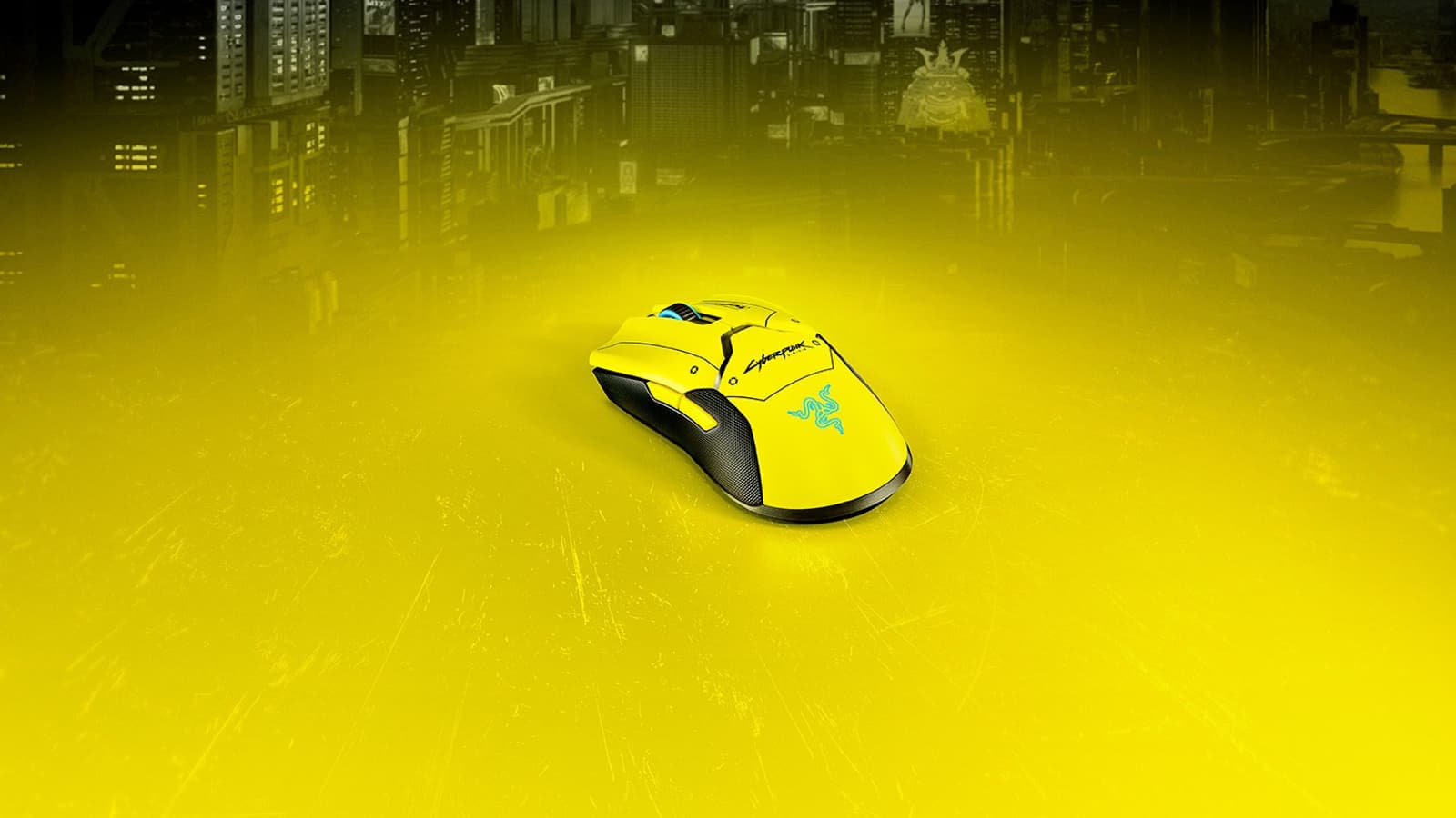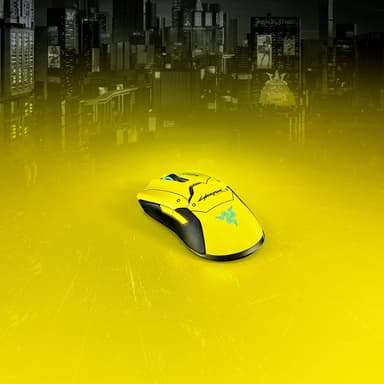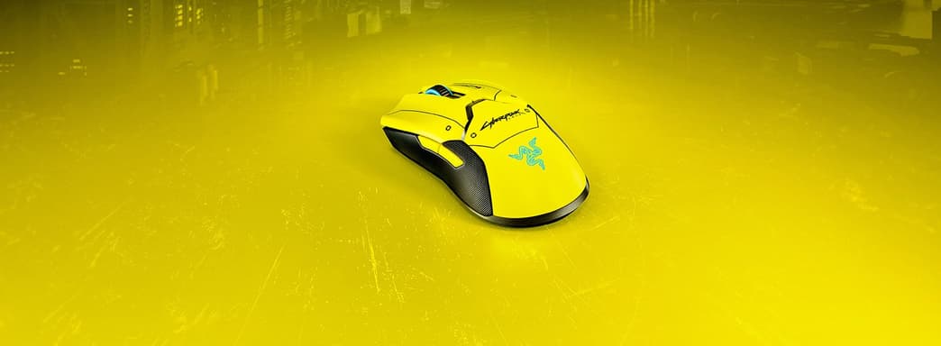 Razer Viper Ultimate Cyberpunk 2077 Edition - специальная версия мыши Razer Viper Ultimate. В глаза сразу бросаются ярко-желтый цвет и надпись «Cyberpunk 2077», а бирюзовые круг и логотип Razer играют на контрасте.