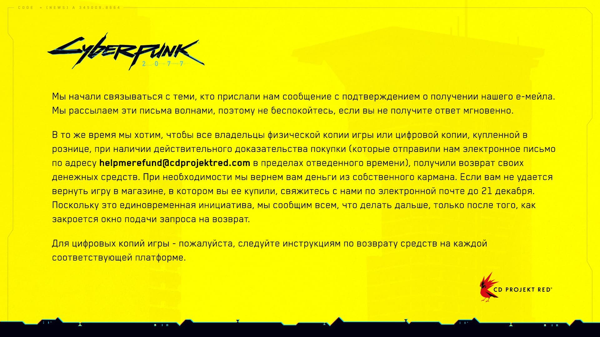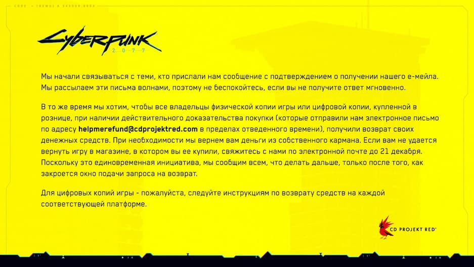 Игрокам просто нужно написать на «helpmerefund@cdprojektred.com» до 21 декабря, предъявив доказательство покупки и дождаться ответа CDPR.