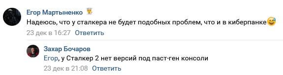 Менеджер по связям с общественностью студии GSC Game World на своей странице в ВК поделился фанатским артом, в котором сочетаются элементы из S.T.A.L.K.E.R. и Cyberpunk 2077. В комментариях один из пользователей выразил надежду на то, что у «Сталкера не будет подобных проблем, что и в Киберпанке». В ответ Бочаров заявил, что S.T.A.L.K.E.R. 2 не появится на консолях прошлого поколения.