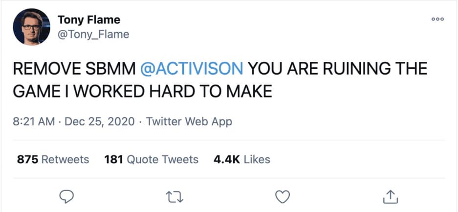 У ведущего дизайнера Call of Duty: Black Ops Cold War не очень хорошо складываются рождественские праздники. Речь о Тони Флейме, чей аккаунт в твиттере был взломан обозлённым владельцем игры. Пользователь обратился от его имени к издателю и приказал удалить из игры систему подбора игроков на основе навыков (SBMM), которая, по его словам, разрушает последнюю CoD.