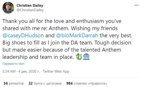 Напомним, коммерческий провал Anthem привёл к тому, что издатель решил перезапустить игру и Bioware работает над большим обновлением. Руководителем проекта являлся Кристиан Дейли, но теперь разработчик присоединился к команде Dragon Age.