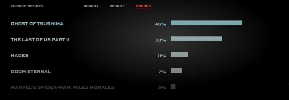 В третьем раунде пользовательского голосования в погоне за титул «Игры года» уверенно лидирует песочница Ghost of Tsushima. Последний проект студии Sucker Punch имеет 46% голосов. В свою очередь The Last of Us Part 2, занимавшая первую строчку ранее, откатилась значительно назад и расположилась на втором месте с 34% голосов.