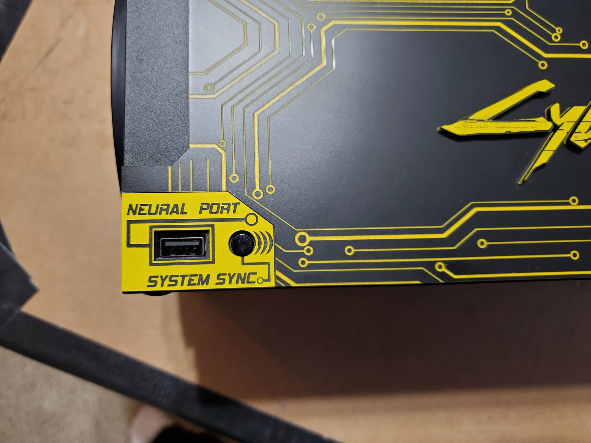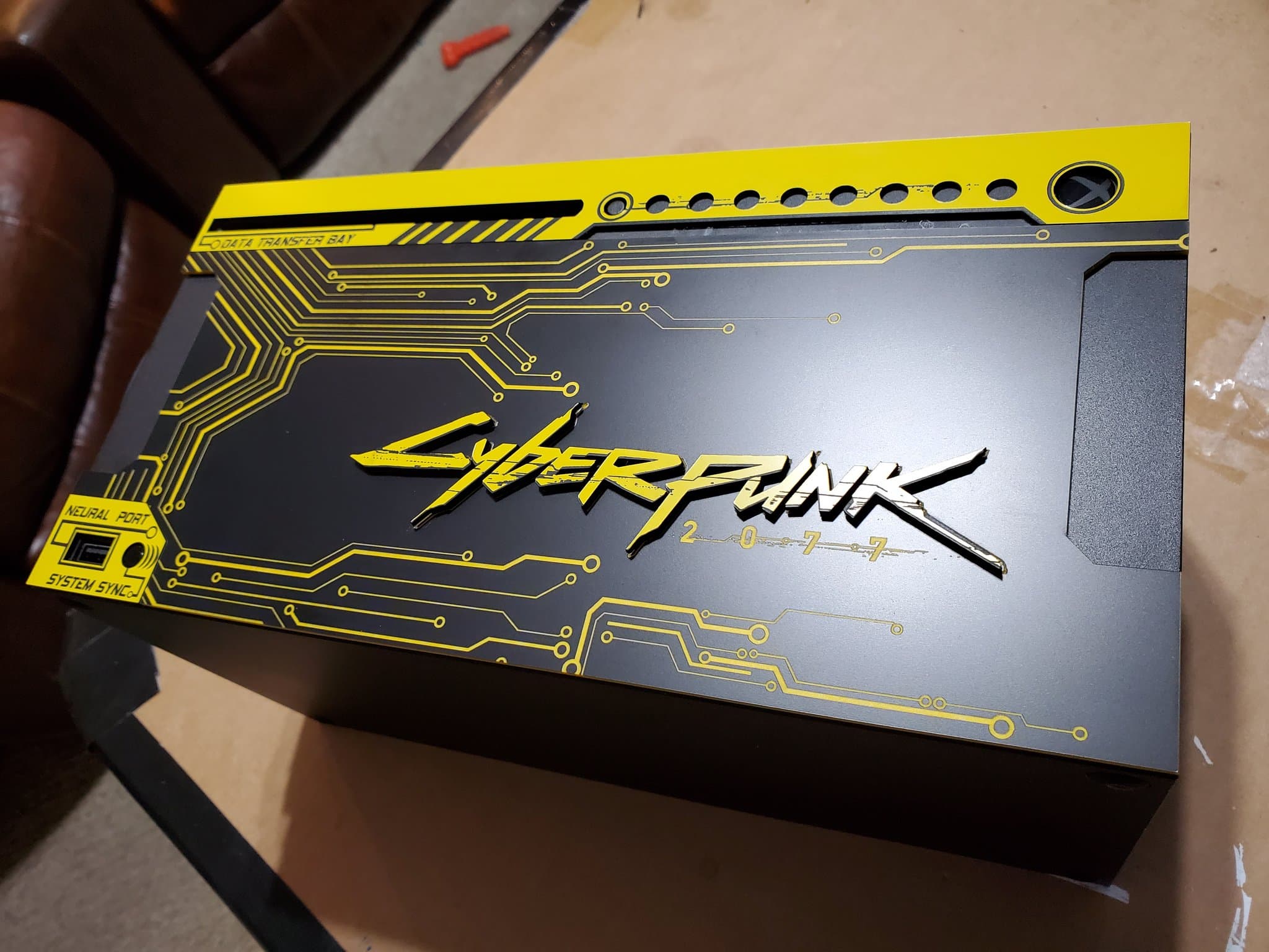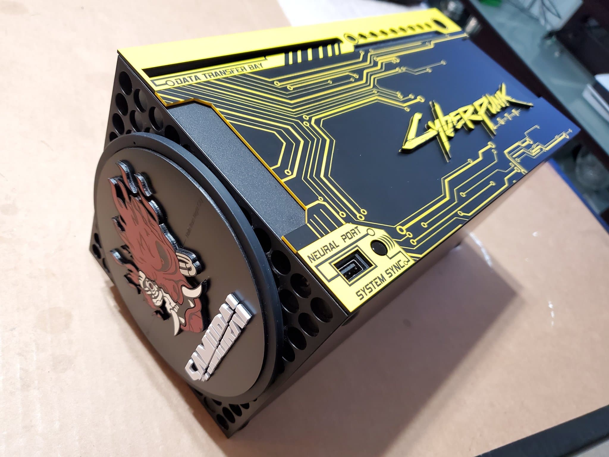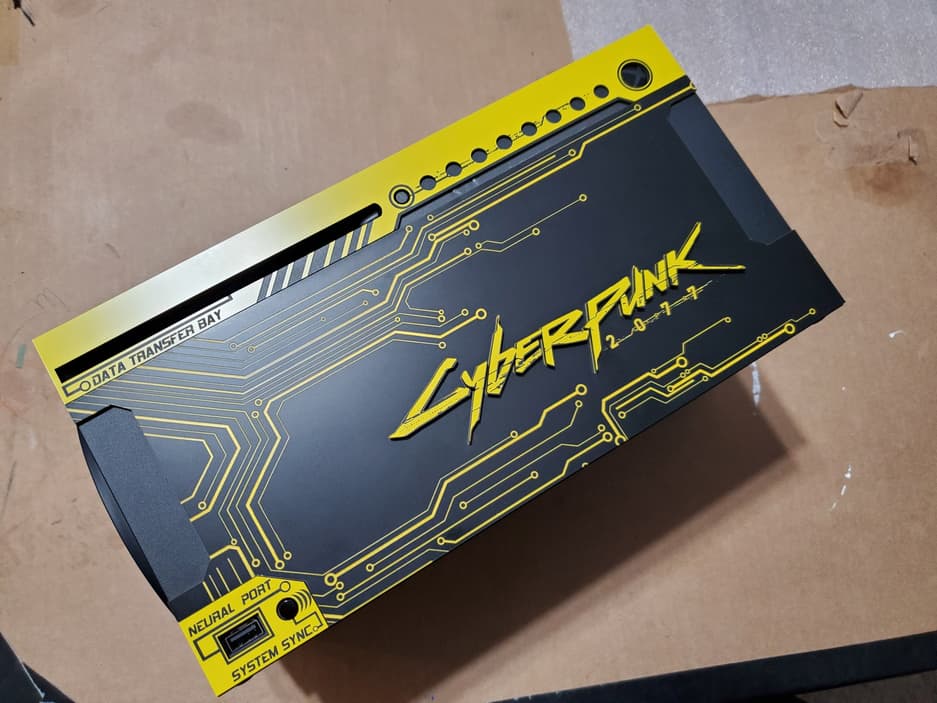 Энтузиаст под ником Game Reaper 187 продемонстрировал консоль выполненную в стилистике Cyberpunk 2077. Пользователь отметил, что перед нами не финальная версия. В финальной версии будет также отделка из нержавеющей стали. На корпусе консоли можно увидеть не только название игры и эффекктное оформление портов, но и символ группы Samurai из вселенной игры, расположенный на подставке.