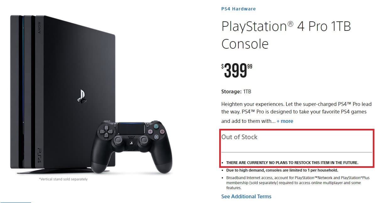 Вскоре после обновления американской версии сайта PlayStation Direct некоторые игроки заметили, что PS4 Pro больше не доступна. Кроме того, рядом с информацией «нет в наличии» есть дополнительная пометка: «в настоящее время нет планов по пополнению количества данного устройства». Конечно, это не значит, что техника внезапно исчезнет с полок магазинов.