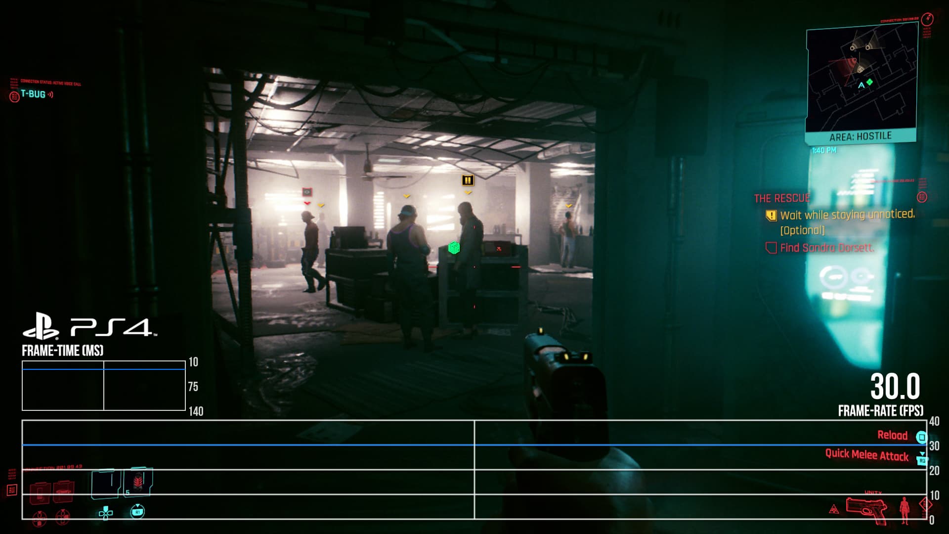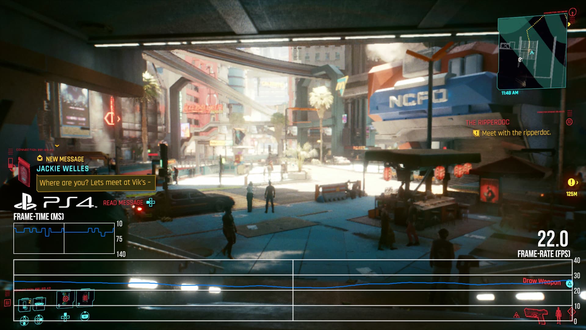 Эксперт Digital Foundry утверждает, что базовые модели консолей уходящего поколения совершенно не тянут Cyberpunk 2077. Неписи постоянно застревают в Т-позах, текстуры либо внезапно выпадают, либо приходится ждать по нескольку секунд, чтобы они вообще проявились, физическая модель пугает своим непостоянством, лицевые анимации могут не проигрываться вовсе — список проблем можно продолжать до бесконечности. И это при том, что разрешение в игре на PS4 и Xbox One колеблется между 720p и 900p, а частота кадров в некоторых сценах падает до 15 в секунду.