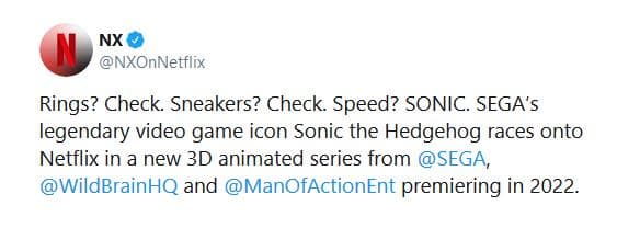 «Кольца? В наличии. Кроссовки? Есть. Скорость? СОНИК. Легендарная икона компьютерных игр ежик Соник устремляется в Netflix в виде анимированного сериала от Sega, WildBrain и Man of Action Entertainment. Премьера в 2022 году».