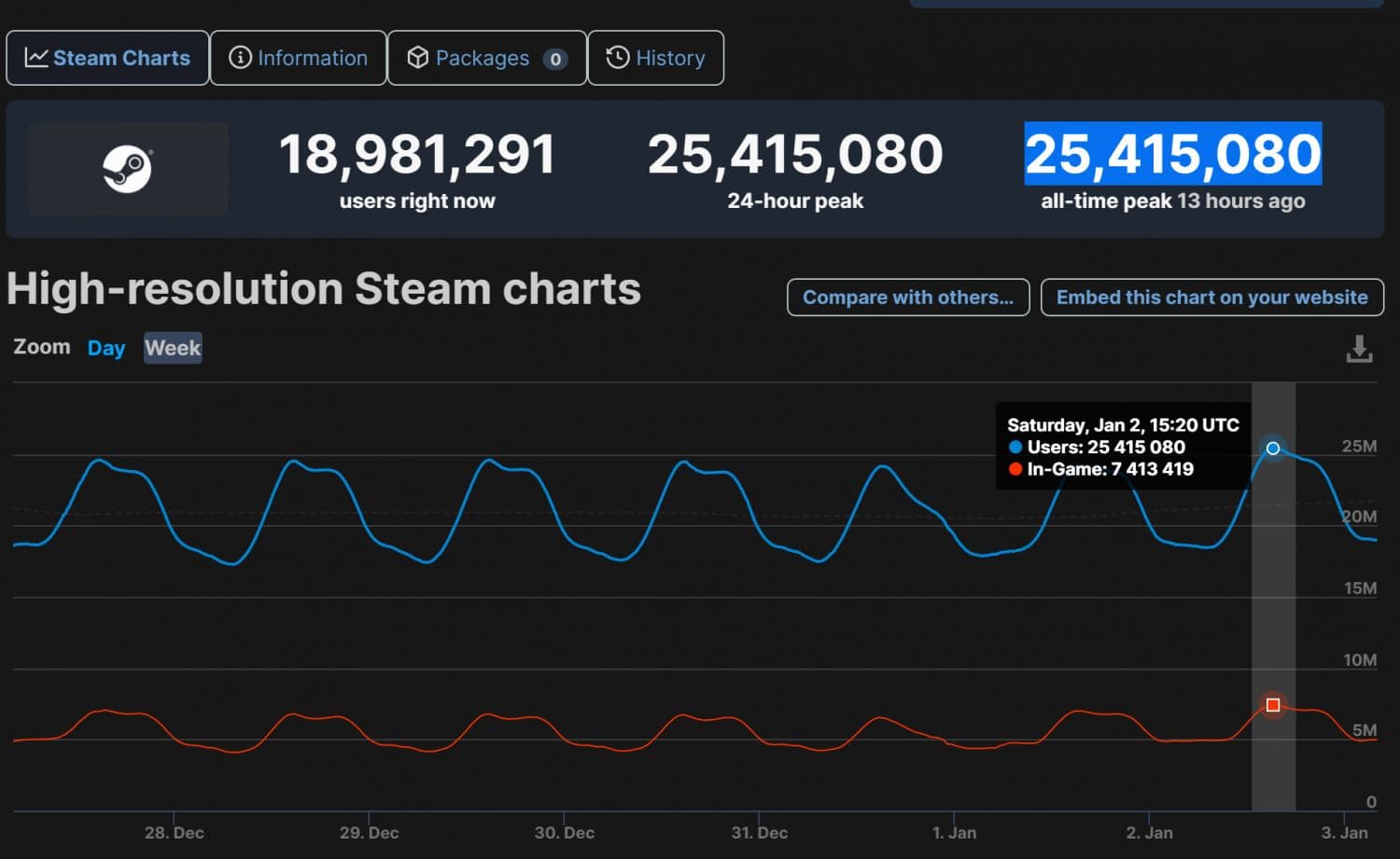 По данным SteamDB, впервые за 18 лет клиент был запущен у 25 418 080 человек, но это не значит, что все они играли. Рекорд был установлен вечером 2 января.