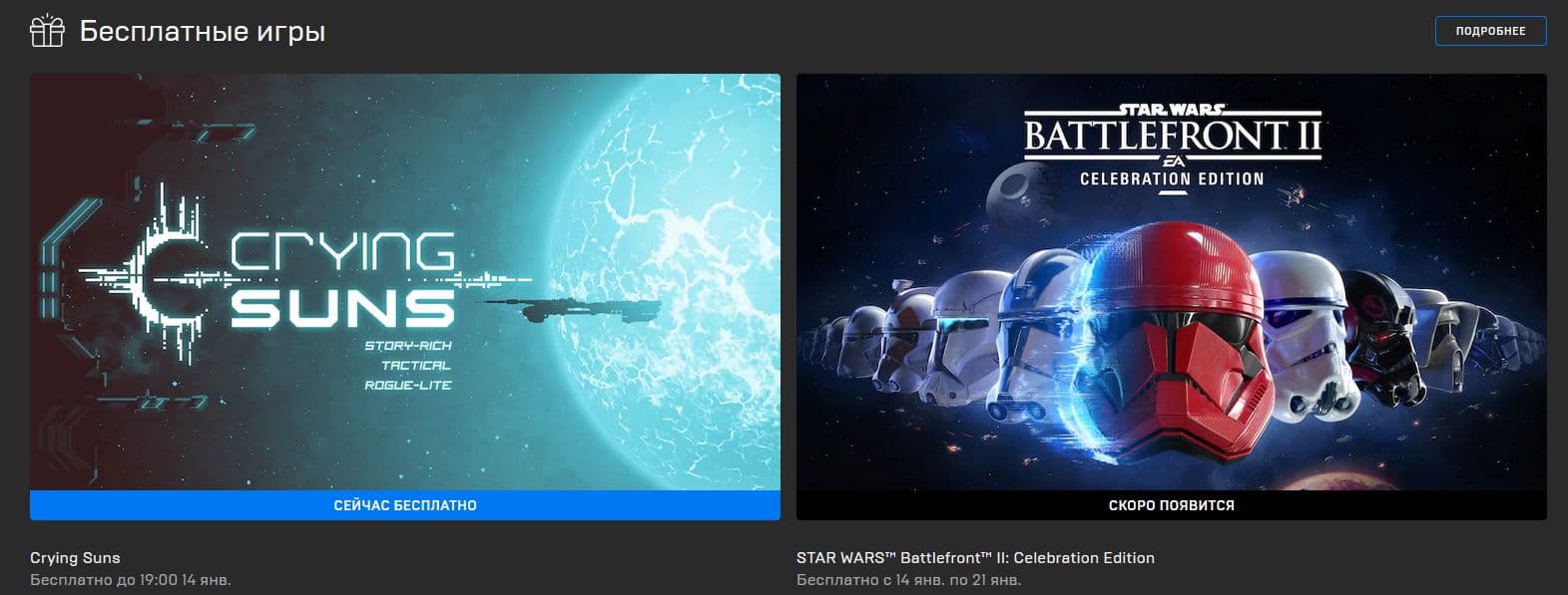 С 14 по 21 января в Epic Games Store пройдёт бесплатная раздача шутера Star Wars: Battleftont 2, который помимо мультиплеера включает в себя одиночную кампанию с эффектными постановочными роликами.
