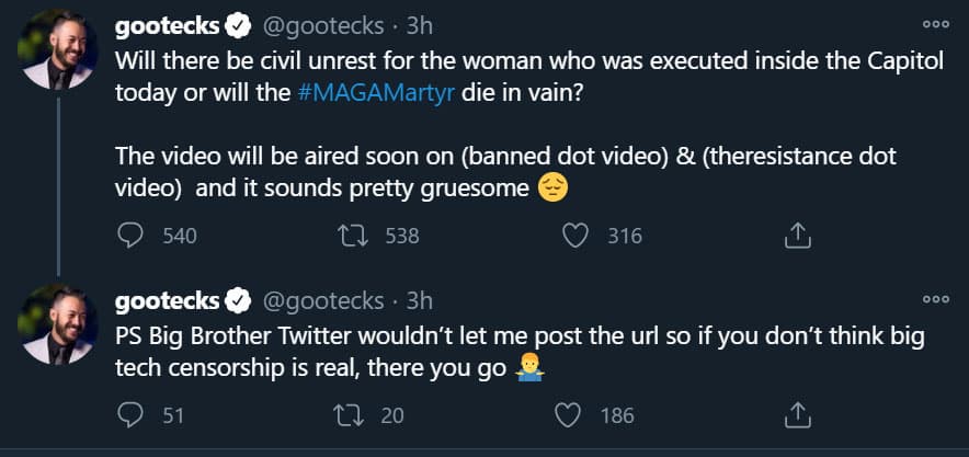 «Будут ли гражданские волнения из-за женщины, казненной сегодня в Капитолии, или #MAGAMartyr умрет напрасно??», - написал в твиттере Гутьеррес. Также он пообещал выложить видео, но «Большой Брат Twitter» не позволил Райану этого сделать.