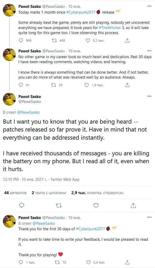 Павел также отметил, что всегда готов изучить отзывы пользователей о Cyberpunk 2077.