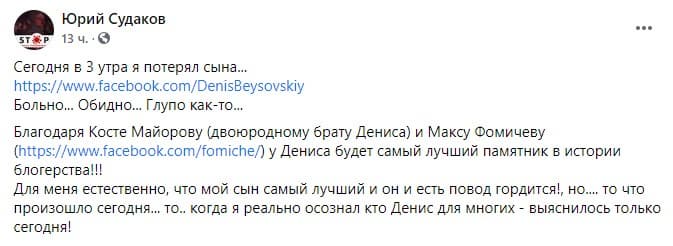 О смерти Дениса рассказал в Facebook его отец Юрий Судаков.
