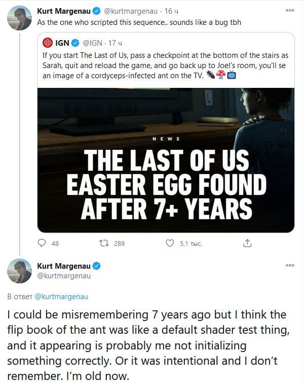 Один из создателей The Last of Us Курт Маргинау увидел эту новость и отметил, что он прорабатывал скрипты во вступительной сцене кампании. По его словам, момент с муравьём похож на баг.